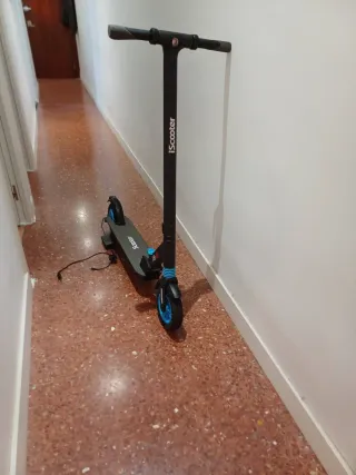 Patinete eléctrico de la marca iScooter en color negro con detalles en azul. Ideal para desplazamientos urbanos. - Manillar negro con puños grises. - Ruedas delanteras y traseras de color azul. - Plataforma negra con logo. - Incluye cargador. - Rueda antipinchazos
