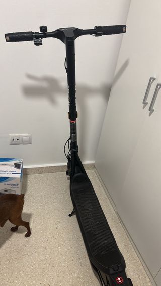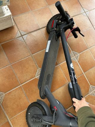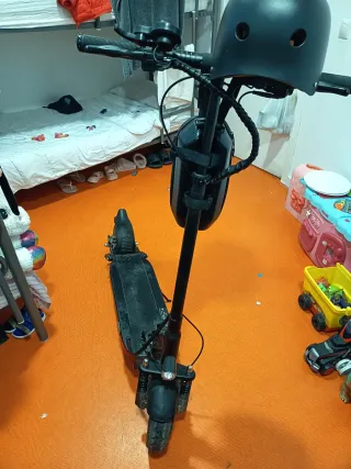 Patinete eléctrico de color negro, ideal para desplazamientos urbanos. - Diseño plegable para facilitar su transporte. - Ruedas delanteras y traseras en buen estado, rueda trasera anti pinchazos. -Tiene algunos desperfectos en la parte trasera ( falta ojo de gato ) de ahí el precio. Entrego con cargador y casco homologado.