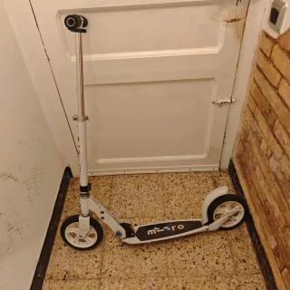Patinete de la marca Micro en color blanco. - Manillar ajustable en altura. - Ruedas de goma. - Plataforma antideslizante.