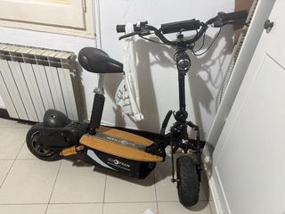 Patinete eléctrico con asiento y plataforma de madera. - Diseño robusto. - Ruedas todoterreno. - Manillar ajustable. ay que reparar un pinchazo en la rueda trasera
