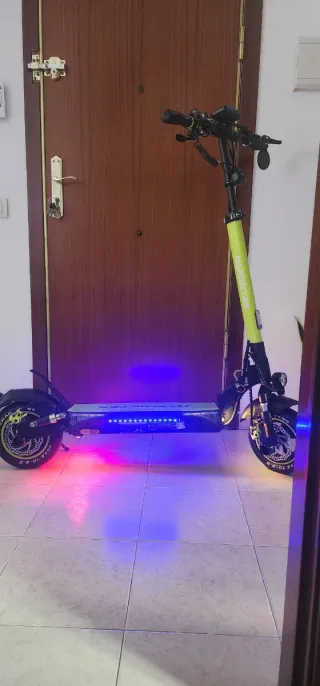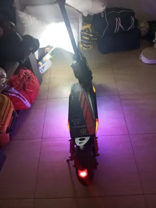 El patinete tiene papeles la bateria esta nueva y tuene doble suspencion las dos ruedas tienen freno de disco y luces de señal luces traseras y delanteras y las de decoracion. Patinete eléctrico diseñado para terrenos irregulares. Cuenta con un diseño llamativo y luces integradas. - Diseño con detalles en rojo, azul y negro. - Calavera decorativa en la base. - Luces laterales naranjas+2xllaves+cargador