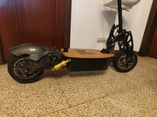 (NO HAGO ENVIOS. SOLO VENTA EN PERSONA) Patinete eléctrico con diseño plegable y plataforma de madera. Las pinzas de freno y las luces estan desmontadas,pero lo tengo. SIN BATERIA Y SIN CONTROLADORA. Vendo por piezas también. - Rueda delantera y trasera. - Manillar ajustable. - Guardabarros trasero.