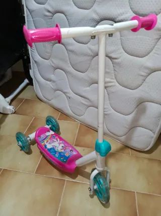 Patinete de tres ruedas, rosa con diseño de unicornio. En muy buen estado.