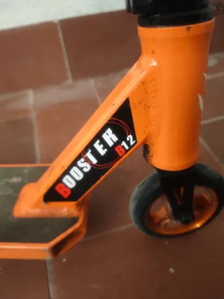 Patinete de la marca Bestial Wolf, modelo Booster B12. - Color naranja y negro. -Patinete para riders Pro -Rueda de aluminio de alto rendimiento -Tabla de aluminio de 110 x 500mm con freno Flex - Alto:86; Largo:77 - Suspensión delantera Costo 130€