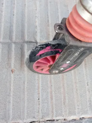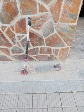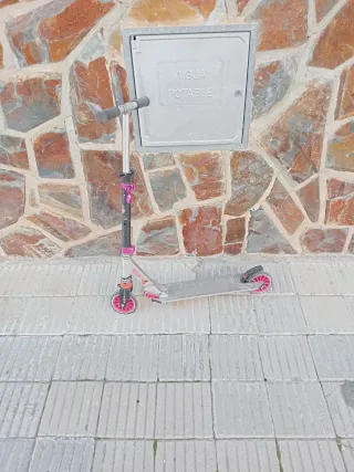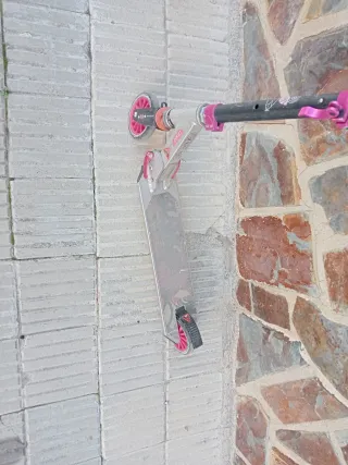 Patinete de la marca Oxelo, ideal para los más pequeños. Su diseño es ligero y fácil de manejar. - Plataforma con superficie antideslizante. - Ruedas de color rosa. - Manillar ajustable en altura. -Rueda delantera rota. Habrianque cambiarla.