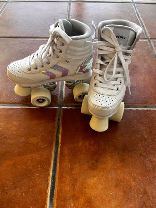 Patines para niños de la marca Oxelo en blanco con detalles plateados. Con muy poso uso, como nuevos. Se llaman tambien Roller Skates o quad de fitness y tienen ruedas polivalentes y el tobillo mas alto, son muy comodos. Para el inicio de patinaje artistico, para pasros urbanos, roller disco etc Perfecto para regalo de navidad En Decathlon valen 54,99€ Vendo tambien rodilleras, muñeceras y coderas de Oxelo en XS