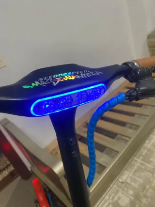 Patinete eléctrico con luces LED azules y amarillas. - Diseño moderno y deportivo. - Plataforma antideslizante. - Ruedas de goma.