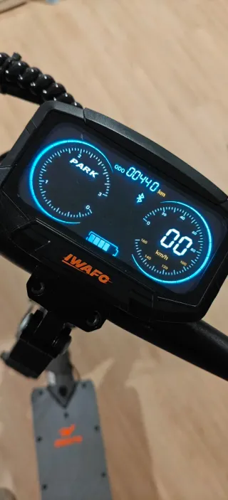 Patinete eléctrico de la marca JWAFO, diseñado para adultos. Cuenta con un diseño moderno y funcional. - Pantalla digital con información de velocidad y odómetro. - Indicador de nivel de batería. - Logo de la marca JWAFO visible.