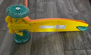 Patinete de tres ruedas con diseño llamativo. - Estructura metálica plateada. - Ruedas con detalles en verde y negro. - Plataforma con diseño gráfico. - Puños negros para un agarre cómodo. *PRECIO NEGOCIABLE **