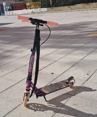 Patinete Oxelo Mid 9 en color morado,comodidad y control. Ruedas grandes de poliuretano de 175mm buena calidad y deslizamiento. Sistema de doble frenado en manillar para un mejor control de velocidad y un freno de pie trasero. Dispone de suspensión delantera para absorber las vibraciones y mejorar la comodidad durante el uso. Y por último su sistema de plegado rápido con doble seguridad facilita su transporte y almacenamiento y además el manillar es ajustable en altura. Perfecto estado.