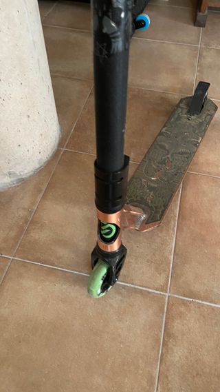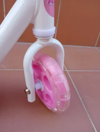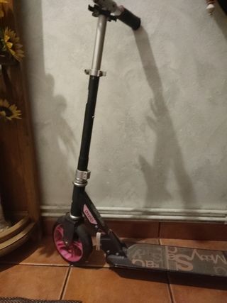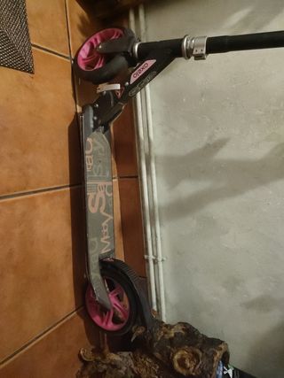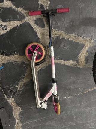 Patinete en buen estado, con muy poco uso. Se vende por falta de uso. - Manillar con puños morados. - Ruedas con detalles rosas. - Correa negra para transporte.