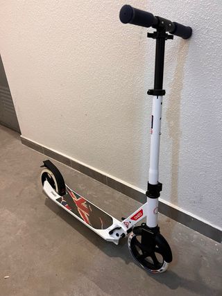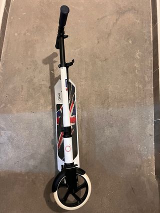 Patinete Oxelo en buen estado. Ideal para desplazamientos cortos. - Color azul y gris. - Estructura de aluminio. - Ruedas resistentes. no tiene ningún detalle a resaltar simplemente marcas de uso en la lija