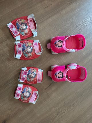 Set de patines y protecciones para niños con diseño de Princesas Disney. Ideal para iniciarse en el patinaje. - Patines ajustables. - Incluye rodilleras y muñequeras. - Diseño con imágenes de princesas.