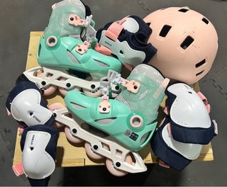 Conjunto completo de patines y protecciones de la marca Oxelo. No se han usado! - Patines ajustables en talla 30-32. - Incluye casco rosa. - Juego de rodilleras, coderas y protectores mano.