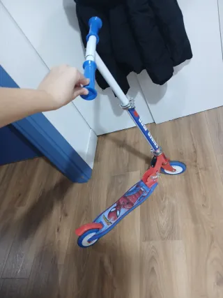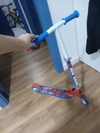 Patinete infantil con diseño de Spiderman. Ideal para los más pequeños. - Manillar ajustable en altura. - Ruedas de goma. - Plataforma antideslizante. Tiene unos 6 meses, súper poco uso.