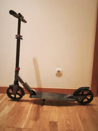 Patinete plegable de color gris y negro con detalles en morado. Ideal para desplazamientos urbanos. Muy poco uso. - Manillar ajustable en altura. - Ruedas de gran tamaño. - Amplia plataforma antideslizante. - Freno de fricción. - Amortiguador trasero. - Carga máxima 100 kg.
