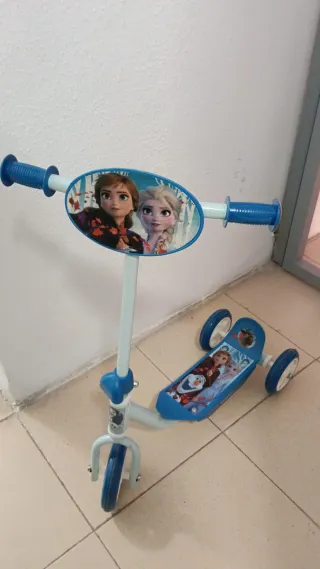 Patinete infantil con diseño de Frozen, ideal para los más pequeños. Cuenta con tres ruedas para mayor estabilidad. - Manillar ajustable en altura. - Plataforma antideslizante. - Ruedas de goma.
