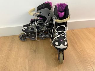 Patines en línea Rollerblade Igniter 90W. - Talla 40 - Ruedas de 90mm. - Cierre de velcro y hebilla. - Diseño deportivo en negro, gris y morado.