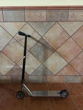 Patinete de estilo freestyle con acabado plateado brillante. - Manillar negro. - Ruedas con detalles de colores. - Plataforma ancha y resistente. - solo le hace falta poner la lija y listo.