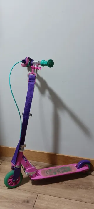 Patinete Oxelo en tonos rosa y morado. Para 4 a 6 años ( con Altura entre 95 cms a 120 cms) - Ajustable en Altura. - Freno en el manillar. - Sistema de plegado. - Correa de transporte morada.