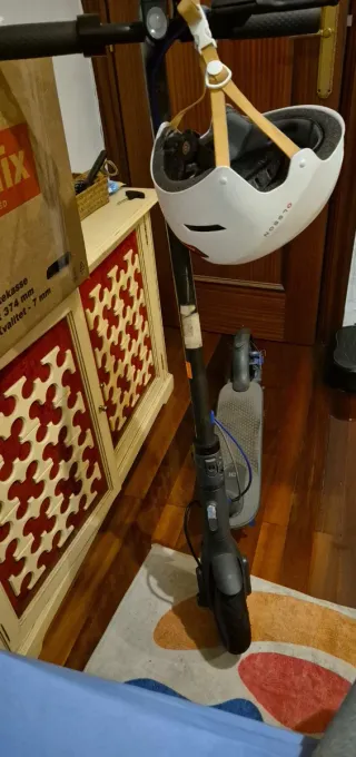 Patinete eléctrico Xiaomi en buen estado de funcionamiento. Listo para usar. - Color gris. - Manillar con puños negros y detalles rojos. - Incluye casco azul.