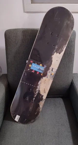 Patinete de la marca Riders Division. Presenta un diseño con detalles gráficos en la parte inferior. Está dañado de la cubierta de arriba, pero la madera está bien. - Cubierta con diseño gráfico. - Parte superior negra.