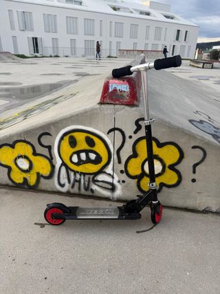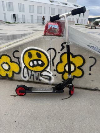Patinete de la marca Tijuana en color granate. - Manillar ajustable. - Ruedas con llantas rojas. - Plataforma antideslizante. - Plegable. - Muy poco usado pero con algunas marcas de caerse.