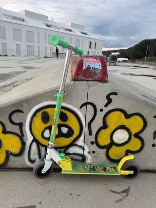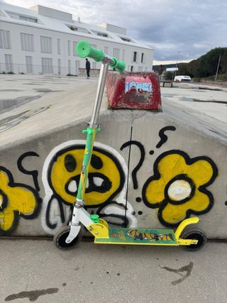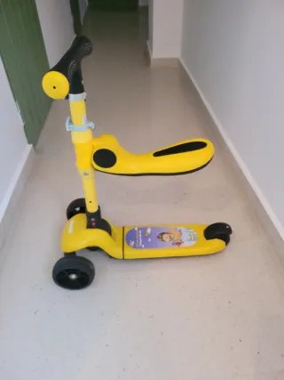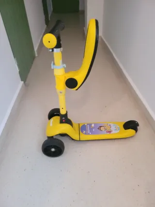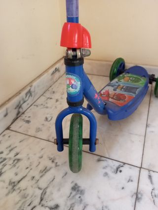 Patinete infantil con un diseño divertido y colorido. - Manillar ajustable en altura. - Ruedas amarillas. - Decorado con pegatinas de personajes. - Plataforma antideslizante. Usado pero esta perfeto