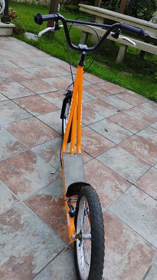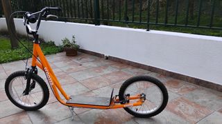 Patinete scooter de color naranja con ruedas grandes, ideal para desplazamientos. Con frenos de bicicleta. Con uso pero en buen estado. - Marco de metal resistente. - Ruedas de gran tamaño para mayor estabilidad. - Plataforma para los pies. - Freno trasero.
