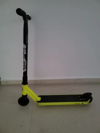 Patinete de estilo freestyle con un llamativo diseño en amarillo y negro. Perfecto para desplazamientos urbanos y trucos. - Manillar negro con puños cómodos. - Plataforma de color amarillo. - Ruedas negras.