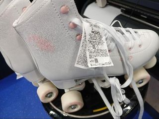 Patines de 4 ruedas en color blanco con detalles iridiscentes. - Diseño alto tipo bota. - Cierre con cordones blancos. - Detalle de franjas laterales iridiscentes. - Talón con acabado iridiscente. - Suela blanca. - Talla 37. Muy poco uso, prácticamente nuevas.