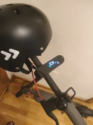 Se vende casco negro y patinete eléctrico. - Casco con diseño moderno y logo blanco. - Patinete con pantalla digital.