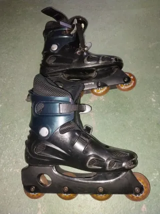 Conjunto de patines en línea para niño, talla ajustable, marca Rollerblade, modelo SG3. Incluye protecciones. Ruedas cambiadas, algo desgastada una lengüeta pero están en perfecto estado. - Patines con ruedas y cordones. - Protecciones para rodillas y codos.