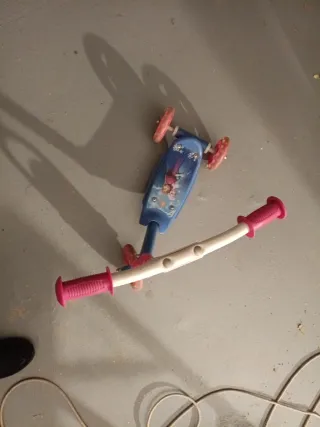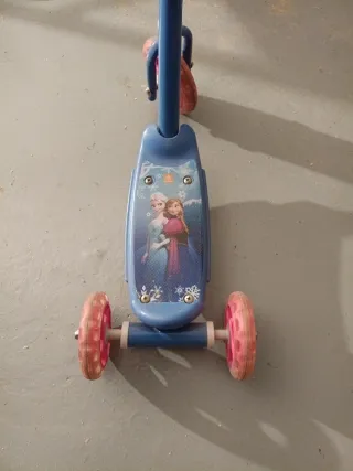 Patinete de tres ruedas con diseño de Frozen. - Base azul con dibujos de las protagonistas. - Ruedas de color rosa. - Puños de manillar rosas.