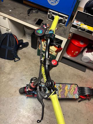 Patinete eléctrico con manillar negro y detalles en amarillo. Incluye pantalla digital y casco. - Manillar con puños negros y detalles rojos. - Pantalla digital con información de velocidad. - Casco de seguridad negro con detalles amarillos.ZWHEEL Z rino dual motor potencia 2 motores de 500w y pico 1,800w baterias principal 48v y 28AH y secundara 48v y 25 AH bms daly48v y 40Ah y 48v30Ah 2 centralitas frenos discos y funcciona perfecto y con potencia velocidad 43km autonomia mas de 80 km. No hago envios se vende en persona.