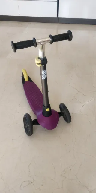 Patinete infantil de tres ruedas en colores morado, negro y amarillo. Ideal para niños/as hasta 5 años. - Plataforma antideslizante. - Dos ruedas delanteras y una trasera con freno de pie. - Manillar ajustable en 3 alturas.
