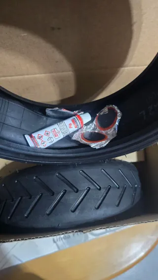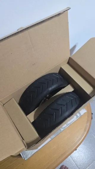 Se venden dos ruedas para patinete, junto con un kit de reparación que incluye pegamento y parches. - Ruedas de goma. - Kit de reparación con pegamento y parches.