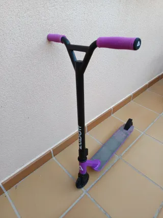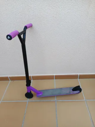 Patinete acrobático Albott, ideal para trucos, acrobacias y diversión. Altura desde la plataforma a la parte alta del manillar 73'5 cms. - Color morado y negro. - Puños de goma para un mejor agarre. - Plataforma antideslizante. Casi sin uso.