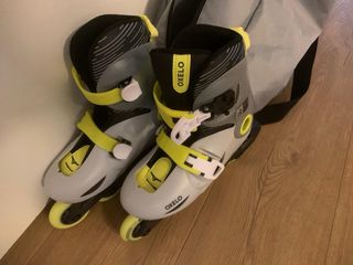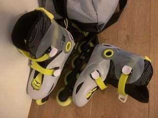 Patines en línea para niño en talla 32. Diseñados para ofrecer comodidad y seguridad. - Color gris y amarillo. - Cierre con velcro y hebilla. - Ruedas de poliuretano.