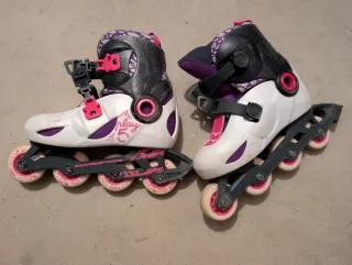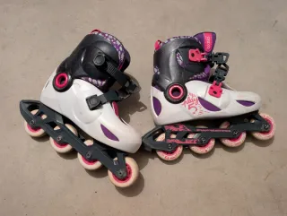 Patines en línea de color negro y rosa, con cordones morados. - Talla 35-38. - Ruedas de color blanco.