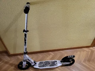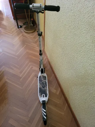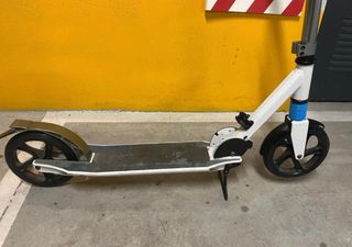 Patinete plegable para adultos, ideal para desplazamientos urbanos. Su diseño es moderno y funcional. - Color negro. - Ruedas con detalles blancos. - Plataforma antideslizante. - Hay que arreglarle el pedal de sujección.