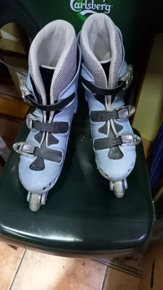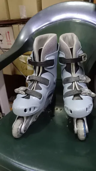 Par de patines en línea de color gris. - Cierre con correas y hebillas. - Ruedas de patinaje. - Diseño deportivo.