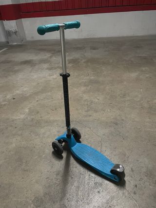 Patinete infantil de tres ruedas en color azul. - Manillar ajustable. - Ruedas de goma. - Plataforma antideslizante. - Tiene una de las gomas del manillar un poco rota (ver foto) de ahí su precio, porque nuevo costo 125€.
