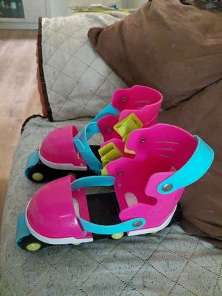 Patinetes en línea de color rosa, azul y verde, diseñados para niños. Son ajustables para adaptarse al crecimiento. - Diseño llamativo y colorido. - Cierre de velcro y hebilla para mayor seguridad. - Ruedas de alta resistencia.
