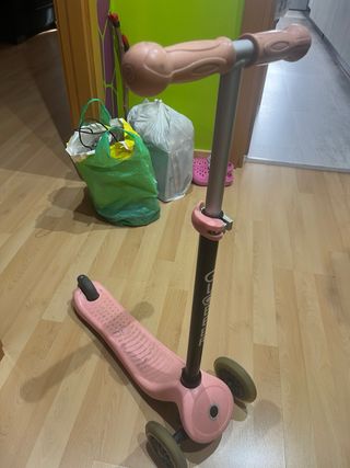 Patinete infantil de color rosa, ideal para paseos y diversión. - Diseño plegable para facilitar su transporte y almacenamiento. - con caballete - Ruedas con luces para un desplazamiento suave.