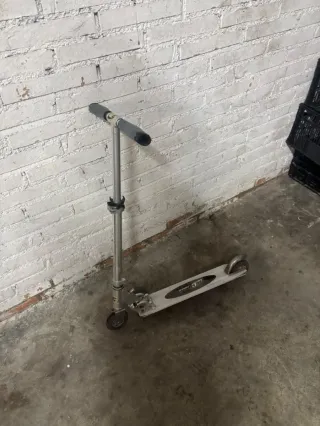 Patinete infantil de color plateado, ideal para paseos y diversión. - Manillar ajustable en altura. - Ruedas resistentes para un deslizamiento suave. - Plataforma antideslizante para mayor seguridad.