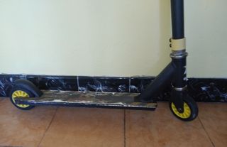 Patinete Nixor Sport en color negro. Robusto y resistente, manillar con puños de goma, plataforma antideslizante. El manillar del Patinete gira totalmente, para hacer piruetas. - Manillar en T. - Ruedas amarillas. Las fotografias aportan a la descripción del producto, es de segunda mano, pero en buen estado. Le falta la tapa plástica de uno de los manillares, lo que no interfiere con su uso.