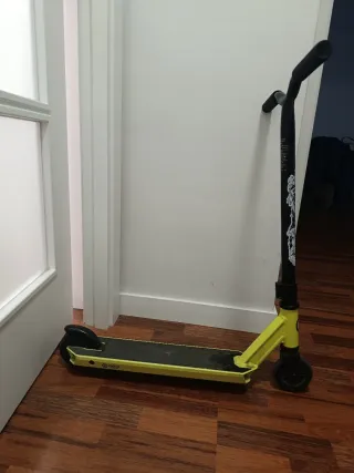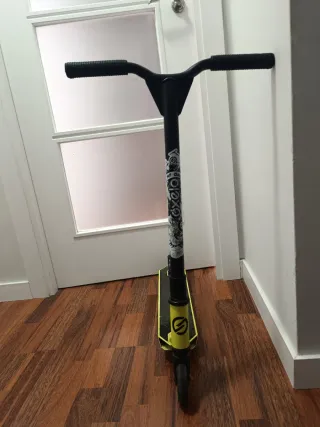 Patinete de estilo urbano con un llamativo diseño en amarillo y negro. Ideal para desplazamientos y trucos. - Manillar negro con puños texturizados. - Plataforma amarilla con detalles gráficos. - Ruedas negras.