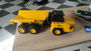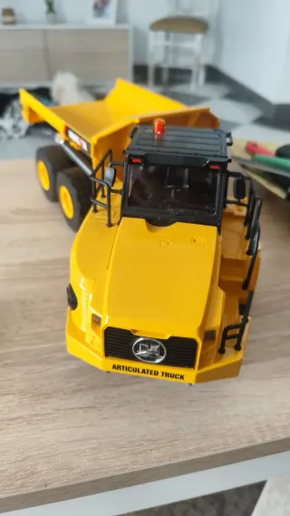 Camión volquete a control remoto de color amarillo brillante. Ideal para coleccionistas o para jugar. - Diseño de camión volquete articulado. - Ruedas grandes para todo terreno. - Cabina detallada con luces.