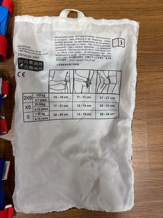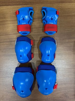 Set de protecciones Oxelo para patinaje o ciclismo. - Incluye muñequeras, coderas y rodilleras. - Talla 2XS. - Color azul con detalles rojos y azules. Puedo acercarlos a Madrid por la zona norte y Odonell